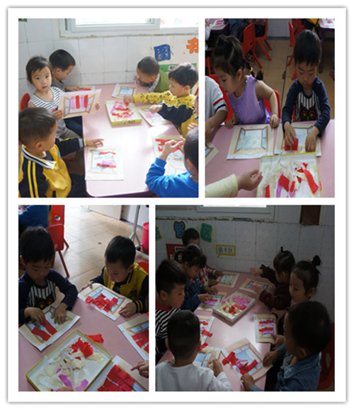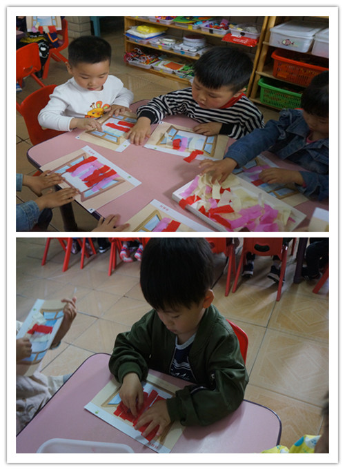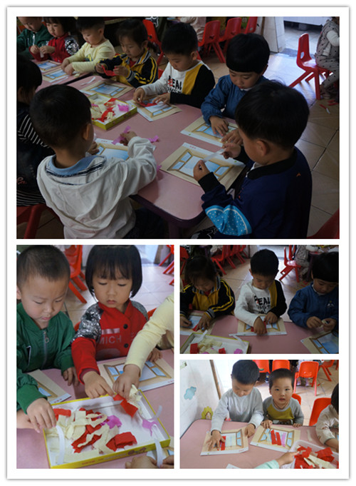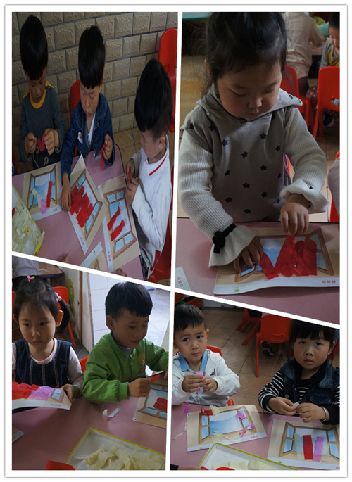 孩子们将自己动手,尝试将一张张的小纸条(窗帘)粘在窗户上,